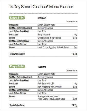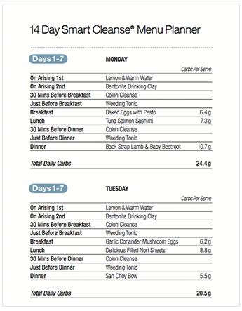 14 Day Smart Cleanse comes with a comprehensive mini booklet that contains all the program information for Detoxification and the Smart Cleanse Weight Loss Plan with Allowable Food Lists, Carb and Calorie Counter, and 30 gourmet detox and weight loss recipes. As a result of adhering to Smart Cleanse you will move closer to your target weight in just 14 days. 95% of customers do reach their target weight on this program.
